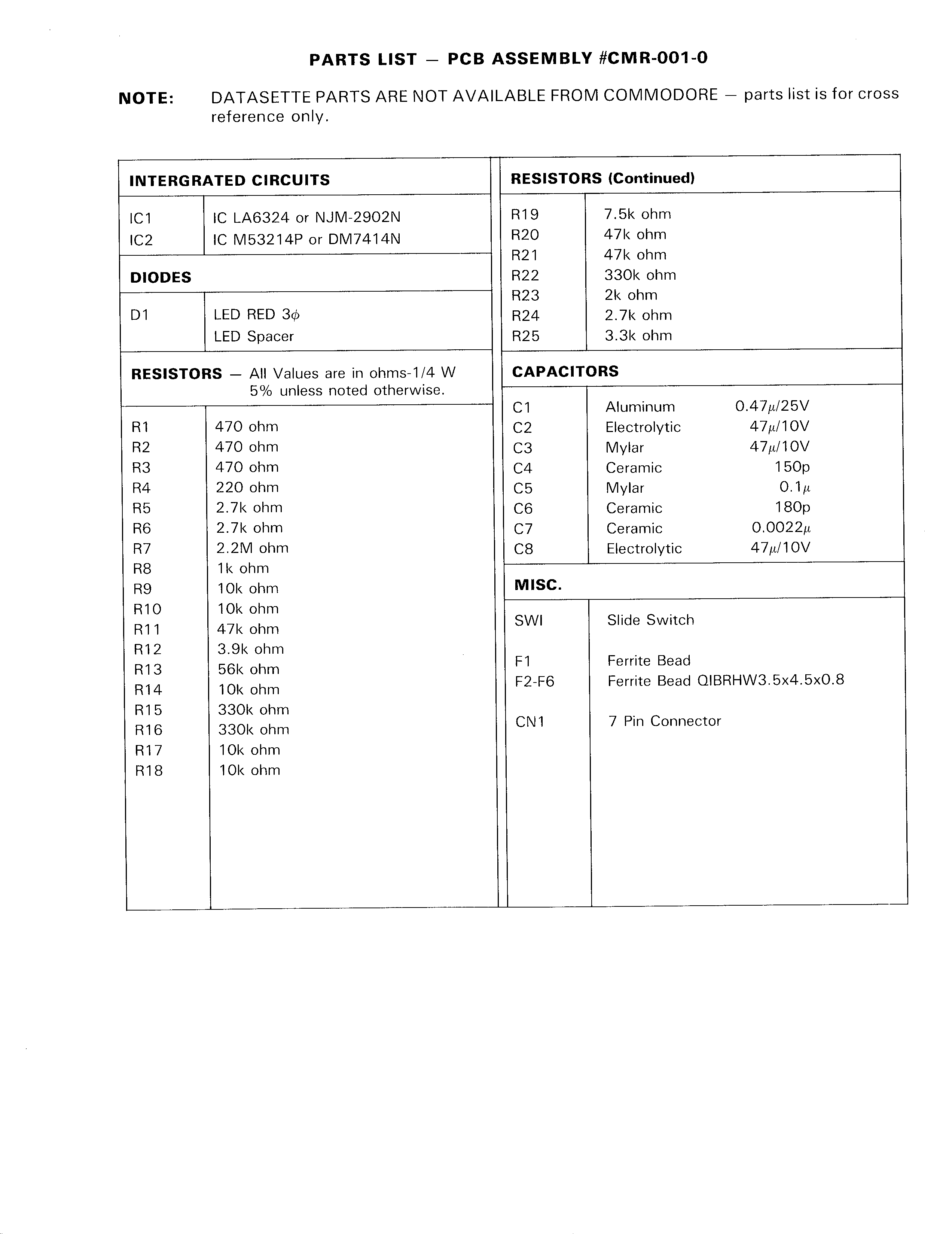 - parts list for #CMR-001-0