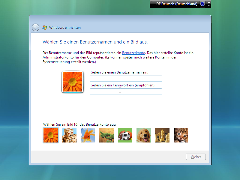 Der erste Start, hier wird man nach Benutzernamen, Passwort, Einstellungen und Sonstigen befragt, das Ganze nennt sich "OOBE" (Out-Of-Box-Experience):
